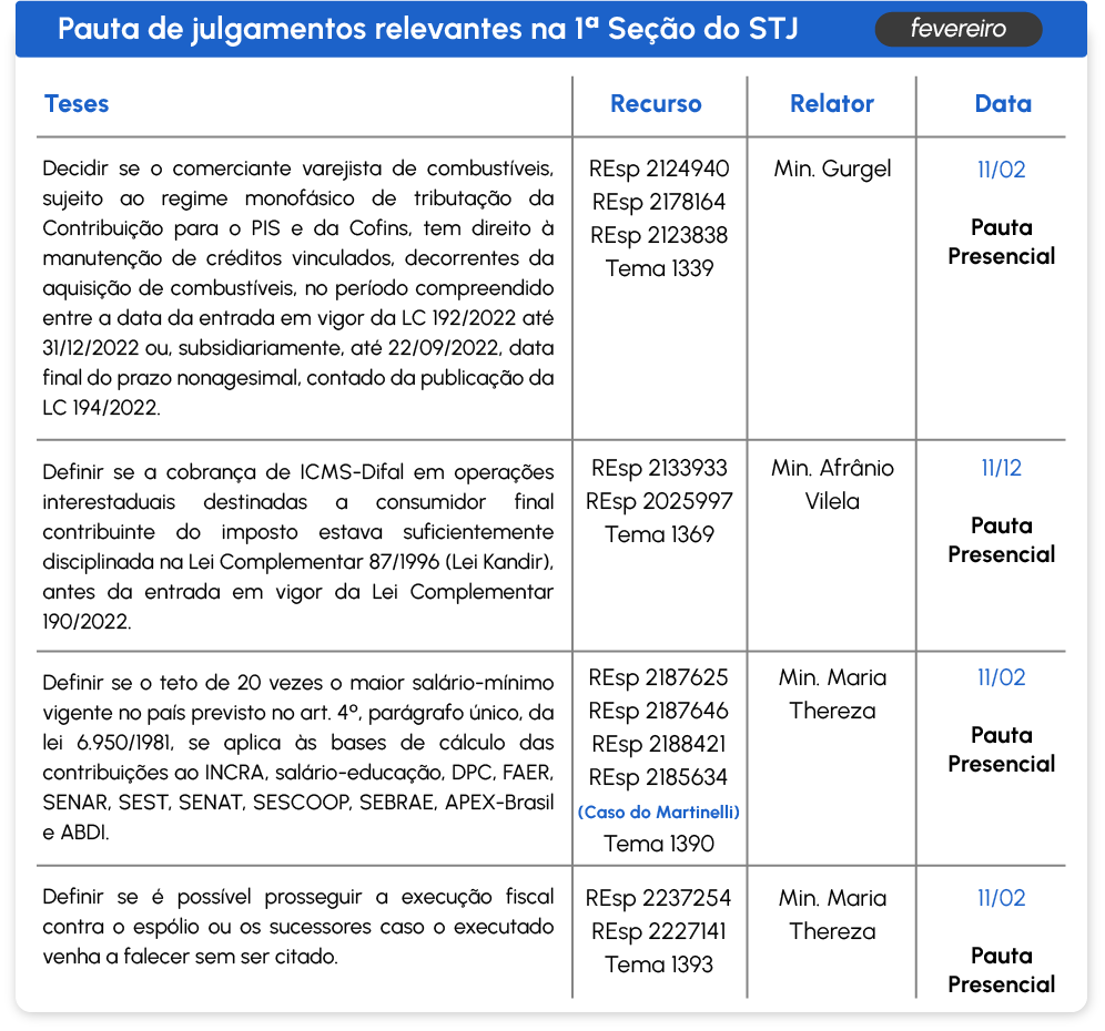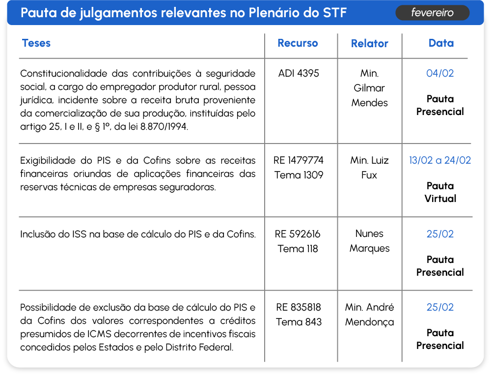 Pauta de julgamentos relevantes | Fevereiro