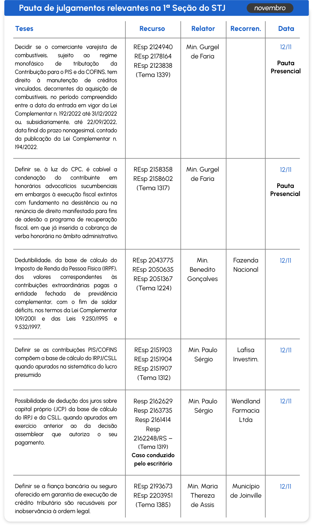 O Superior Tribunal de Justiça, após um pedido de vista do ministro Paulo Sérgio Domingues, suspendeu o julgamento em que discutia a possibilidade de o Imposto sobre Produtos Industrializados (IPI) não recuperável incidente sobre compra de produtos para revenda integrar a base de cálculo dos créditos de PIS/Cofins. Até a suspensão do julgamento o placar estava em um a zero de forma desfavorável ao contribuinte. Ainda não há previsão para continuidade do julgamento.