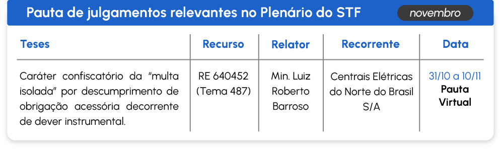 O Supremo Tribunal Federal irá retomar o julgamento que analisa a possibilidade de tributação, no Brasil, do lucro de controladas e coligadas no exterior. O julgamento será na modalidade virtual do dia 07 a 14 de novembro. Até o momento o placar está em três a um pela tributação de IRPJ e CSLL nesses casos. Em que pese o julgamento não seja sob o rito da repercussão geral, o caso é acompanhado com atenção pelo governo, tendo em vista a relevância do jurisprudência que poderá ser formado a partir do resultado desse julgamento.