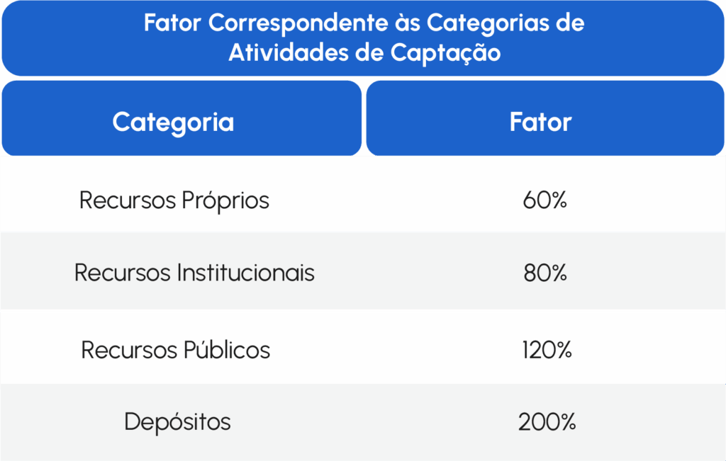(Soma dos valores atribuídos a cada uma das Categorias de Atividades Operacionais Comunicadas + soma do valor da Categoria Restrita ou Livre da Atividade de Investimentos) x Fator de Categoria da Atividade de Captação